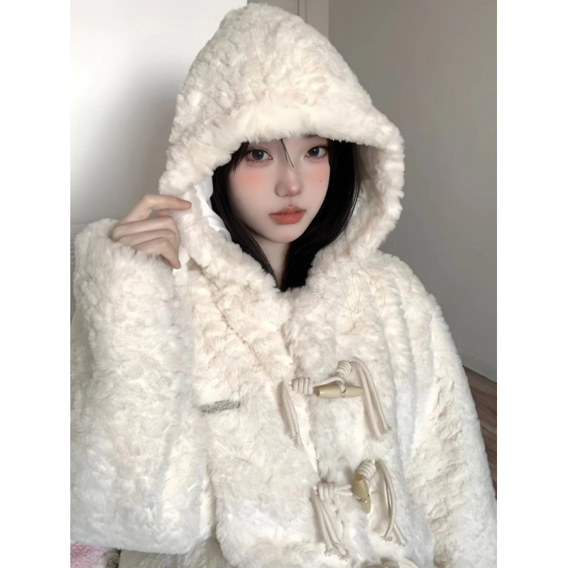 冬の新型2025年の小柄な服装は、ゆったりとした牛の角を厚くして白い子羊の毛と帽子のコートの女性を掛けている