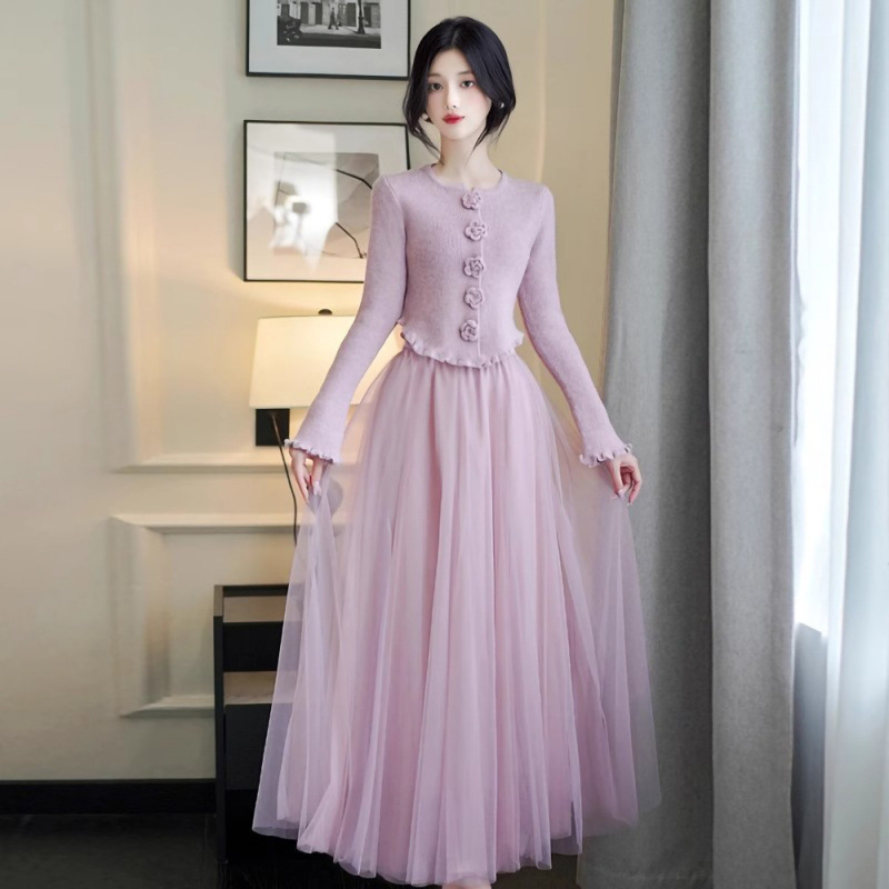 優しい風の甘いピンクのニットのセーターの女性の秋冬のネットの紗の半身のスカートは年齢を減らしますきれいな洋風のスーツのスカートの女性を減らします。