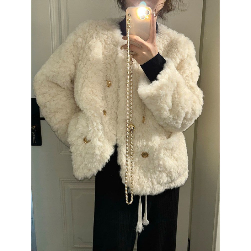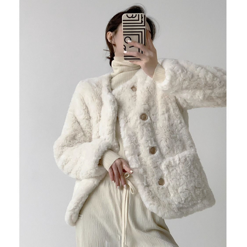 小香風子羊の毛羽立ちの女性2025冬の新型の小柄なゆったりとした白い毛皮の上着の綿服