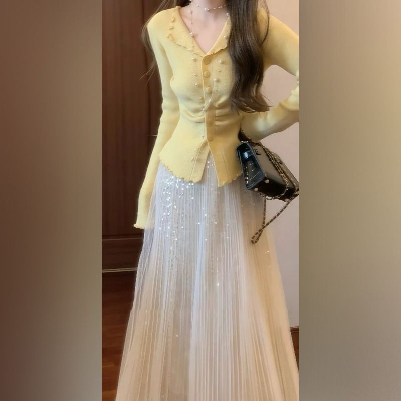 秋冬の新型の甘美な気質のクリームの黄色の耳のレースのニットの網の紗のスパンコールの半身の長いスカートの2セットの女性