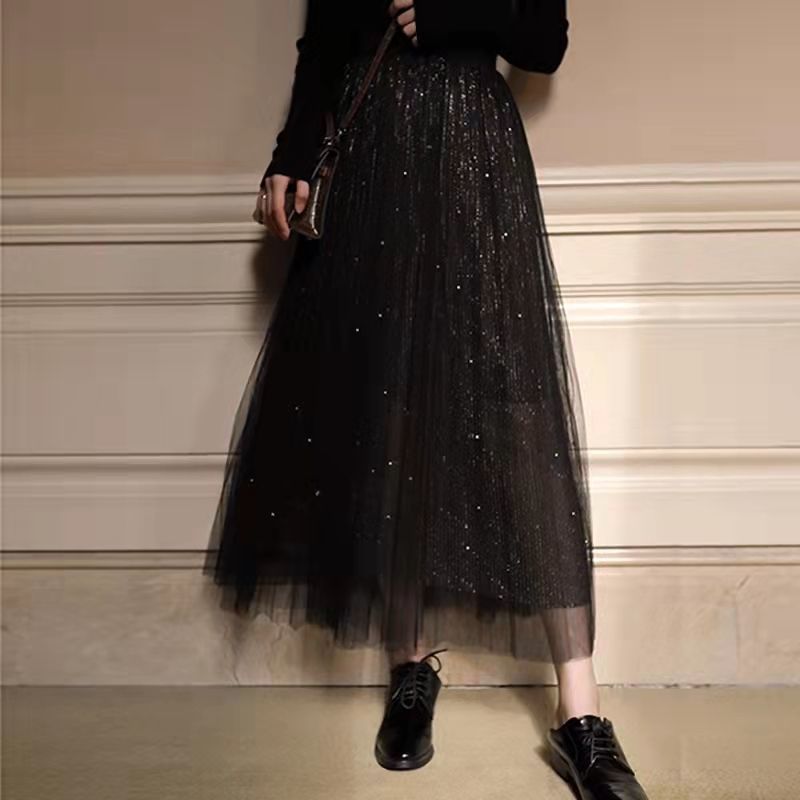 非常に仙人のスカートの網の紗のレースの半身のスカートの女性の春2025新型の中で長いタイプの黒色のアンドロメダの流行の紗のスカート