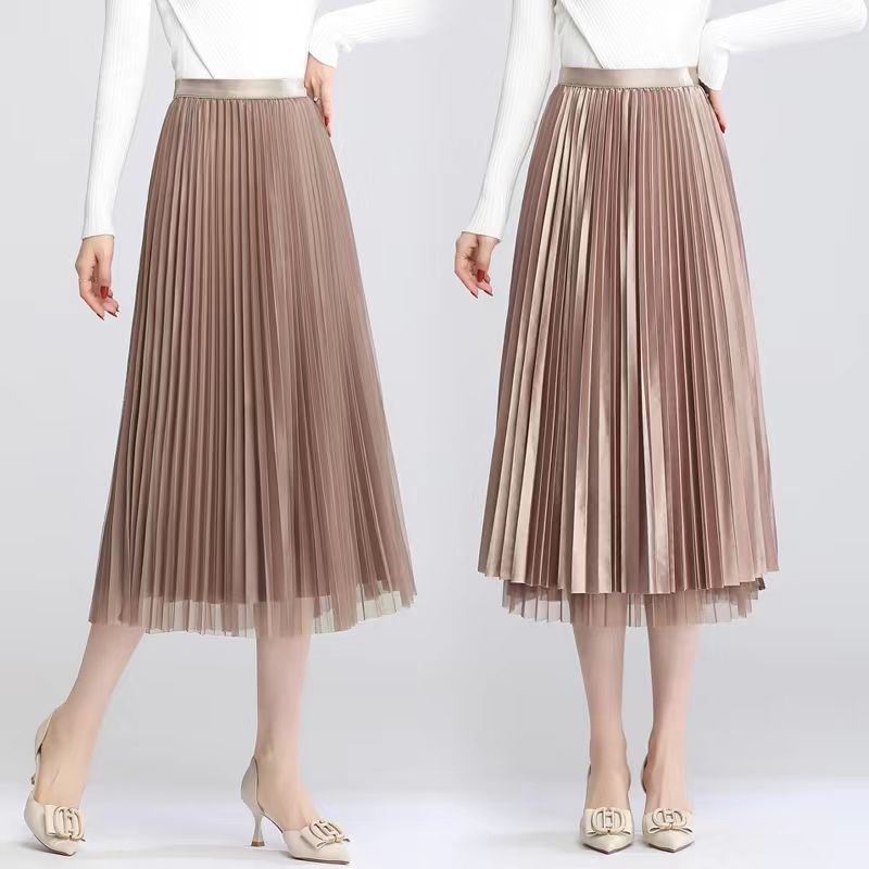 ハイウエスト春秋プリーツスカート レディース メッシュスカート レディース 新作 ドレープ感 リバーシブル シフォンスカート 大きめスカート Aラインスカート