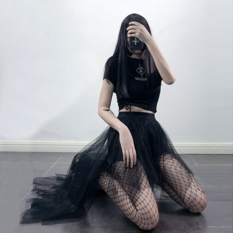 ロングタイプの超仙の黒いガーゼのスカートの女性の半身のスカートの網の紗の不規則なデザイン感のスカートのお姉さんの軽い熟風の暗い黒の系