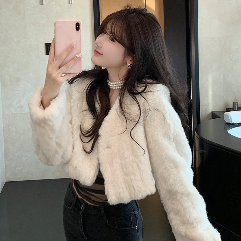 新型の毛のコートの女性の冬の高級感の短いvネックの名媛のぬいぐるみの羊の小毛はウサギの毛の環境保護の毛皮の女性をまねます。