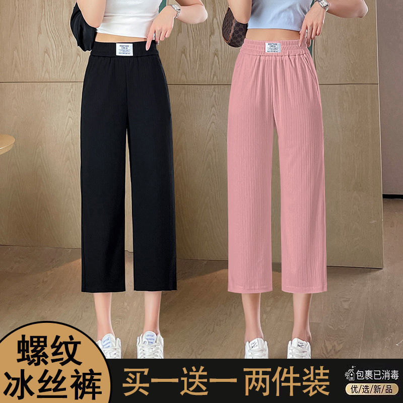 夏のハイウエスト、スリム、快適、通気性、薄い2ピースアイスシルクカバー肉ルーズワイドパンツ女性用新しいカジュアルクロップドパンツ