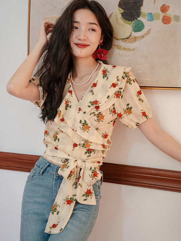 大きいサイズフレンチシックニッチ花柄トップ女性の夏のウエストストラップ半袖シフォンシャツショート香港スタイル