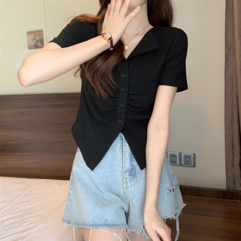 夏2025新型韓国版小柄ショートタイプ高腰修身上着心機鎖骨半袖tシャツ女ins
