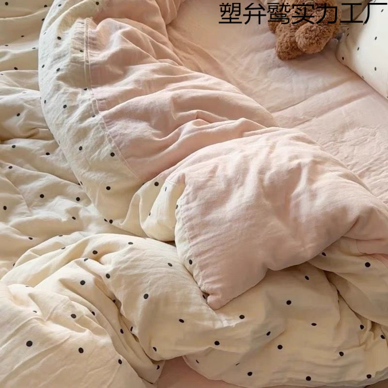クリーム水玉ウォッシュコットン4点セット、肌に優しいソフトシーツと掛け布団カバー、学生寮用寝具3点セット