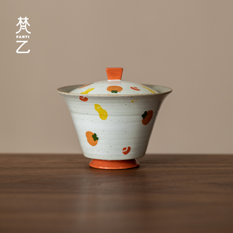 梵乙の手描き柿の馬蹄の蓋の碗は柴をまねてお茶の碗の釉薬を浸します。