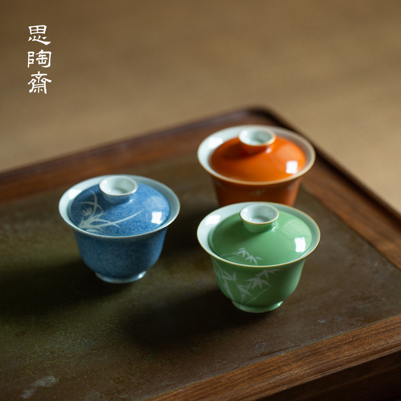 思陶斎の手描きの描写の工芸の竹の蓋の碗の単一の高級な陶磁器のお茶の碗の家庭用の小さいサイズの工夫の茶器