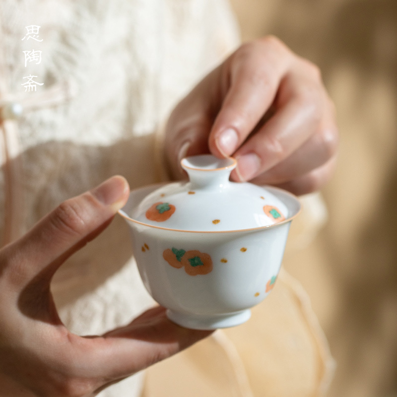 思陶斎手描き柿如意蓋碗家庭用白磁二才茶碗単一工夫茶器セット
