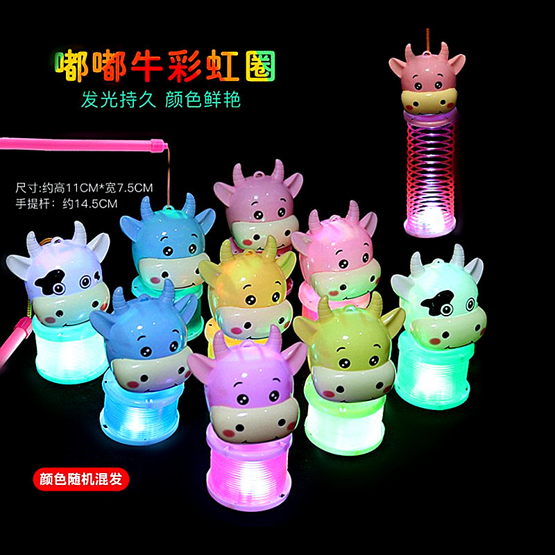 牛の年の子供の漫画の虹の輪のスプリングは提灯を手にして発光します。