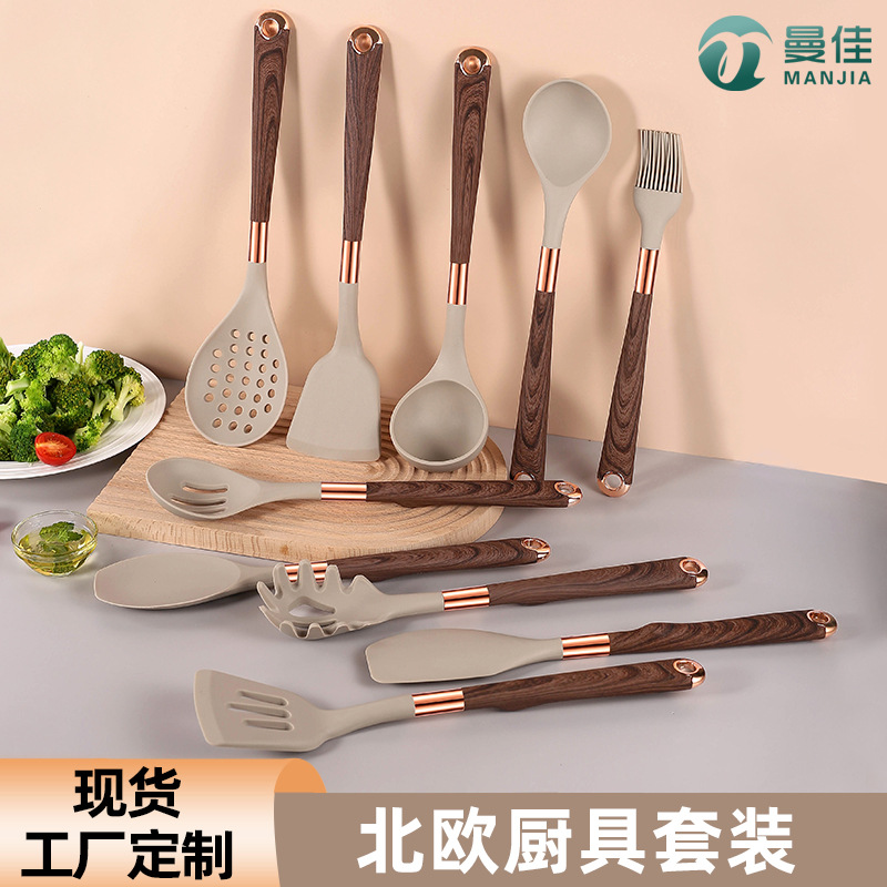 新商品のシリカゲル木目調理器具12点セットは鍋にくっつかないシャベルスプーンの耐熱カバーハンドルセットです。