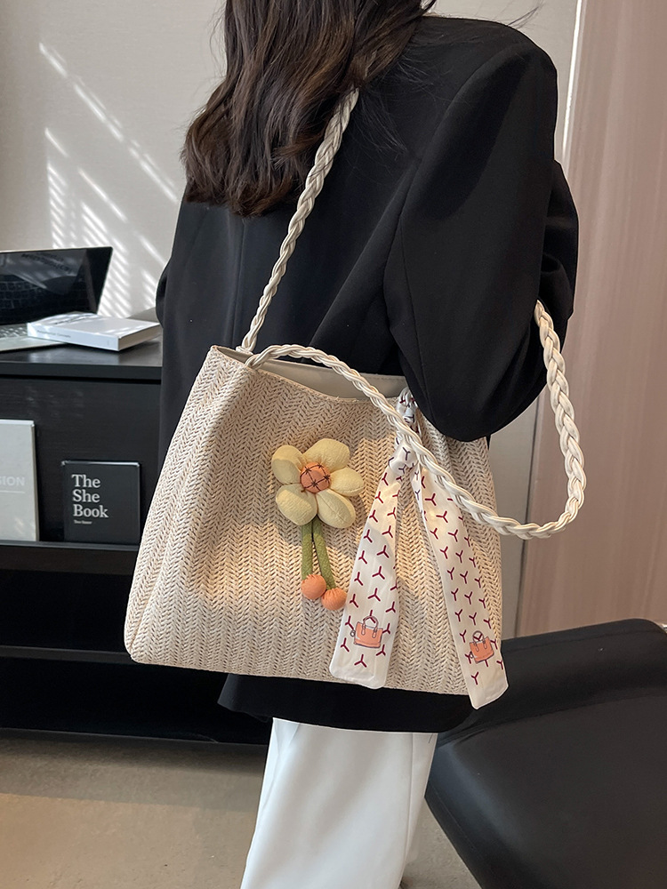大容量バッグ女性2025新型百合シングル肩海辺休暇ビーチバッグ編み草編通勤バッグ