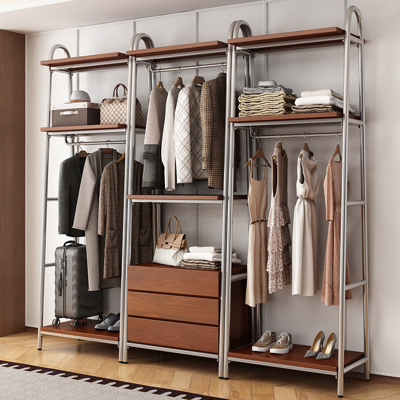 金属ワードローブホームベッドルーム無垢材アイアンワードローブウォークインハンガーフロアオープンクローゼット収納ラック