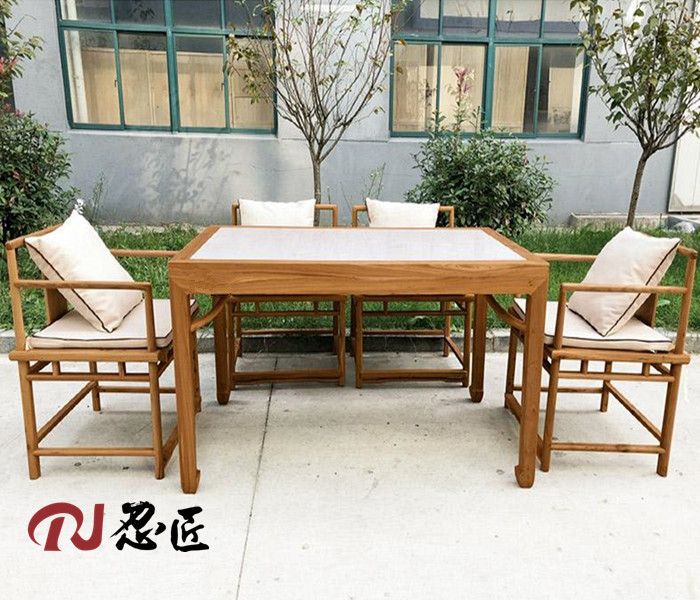 古いニレ材のダイニングテーブル、大理石のコーヒーテーブルと椅子、無塗装の無垢材、白大理石の風景画、デスクトップ、ホテルやレストランの家具
