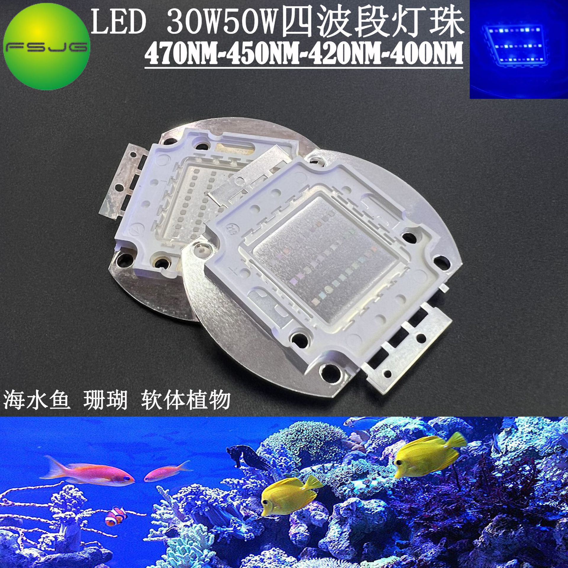 Ledハイパワー集積30w50w 4バンドサンゴ海水ソフト光源450-470-420-400nm