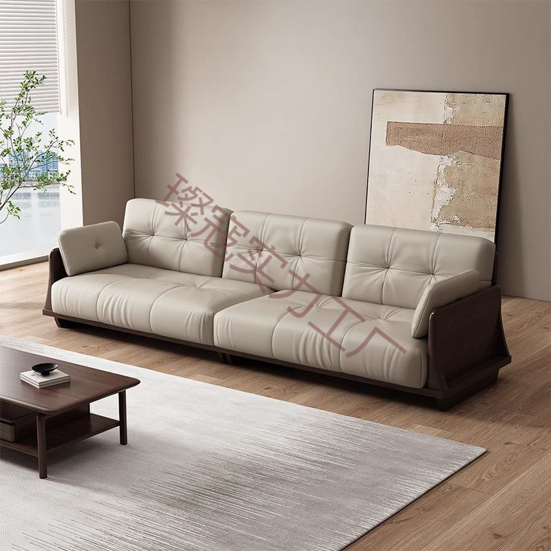 本革ソファー黒胡桃木実木現代シンプル客間頭層牛皮直排小戸型2025新型