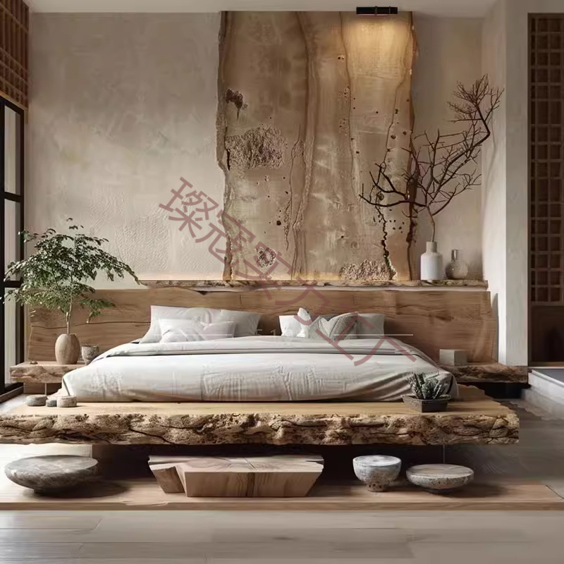 中国風北欧わびさび畳ログローベッドフロアわびさびシンプル全無垢材ウェディングベッドモダンライトラグジュアリー