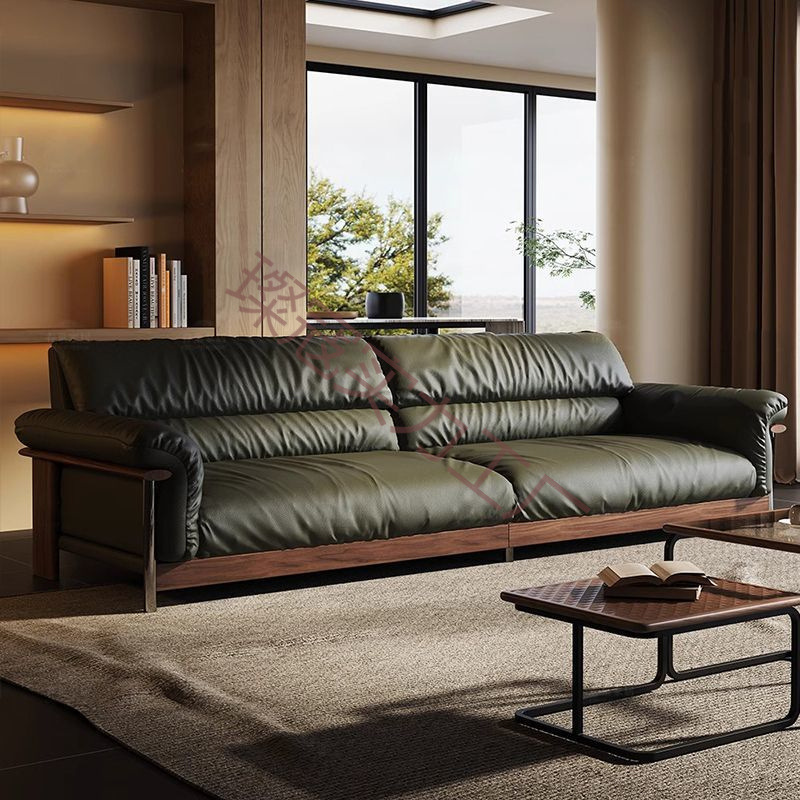 ブラックウォールナット無垢材レザーソファモダンな新しい中国風のシンプルなクラウド小さなアパートのリビングルームストレート列2025新しいスタイル
