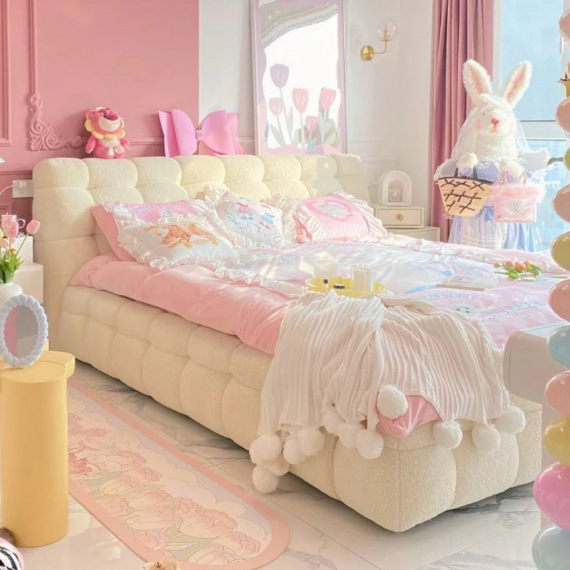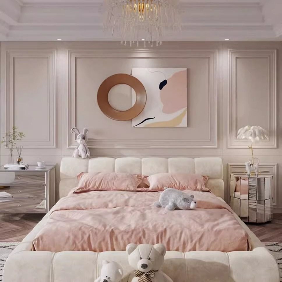 フレンチマシュマロファブリックベッドモダンシンプルホワイトマスターベッドルームラージベッドシェルパ無垢材ダブルベッドライト高級ウェディングベッド