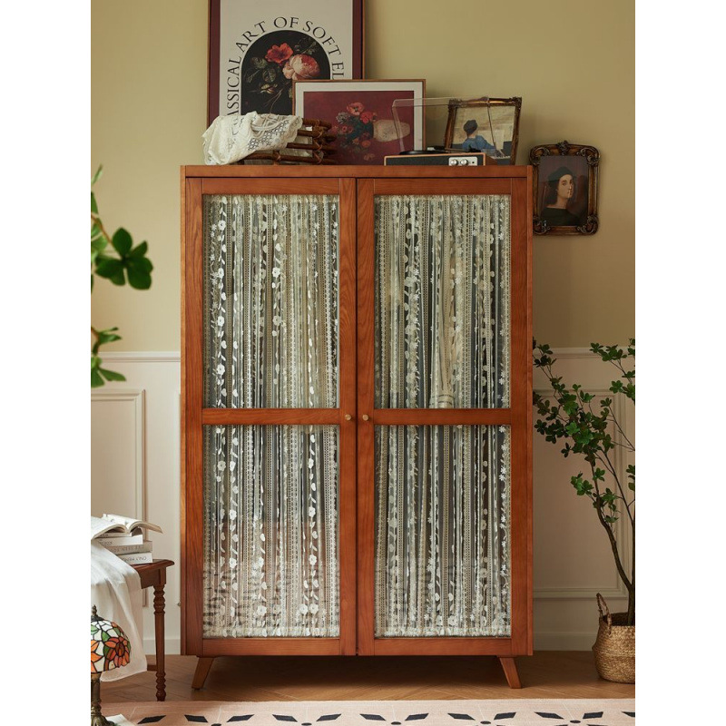 フレンチレトロキャビネット無垢材ワードローブ両開きガーゼカーテンガラスキャビネット寝室ホーム衣類収納大型ワードローブ組み合わせ