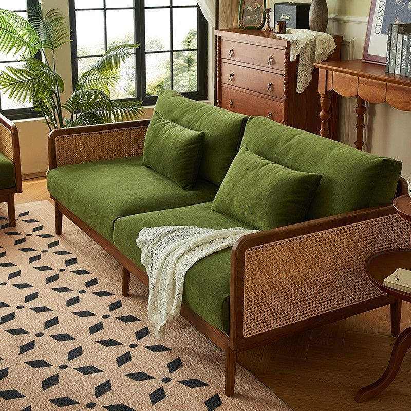 フランス式レトロ白蝋木実木ソファー小戸型客間三人位緑ベルベット直列二人ソファー