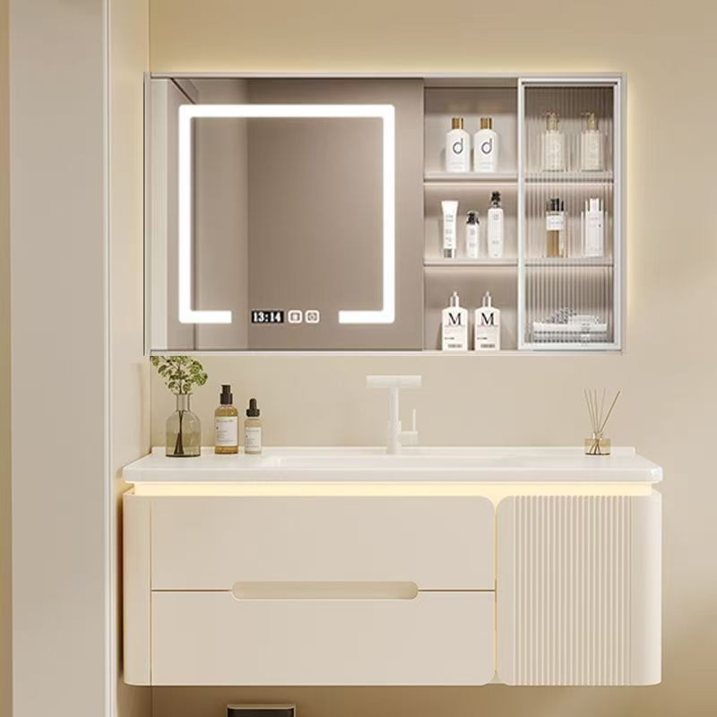 クリームオークのラウンドバスルームキャビネットコンビネーションセラミック一体型洗面台洗面台ミラーキャビネット洗面所