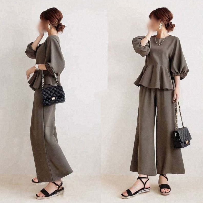 日系新型灯籠袖上着のワイドパンツ2点セット