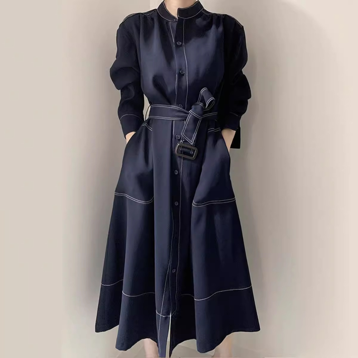 韓国のchi極めてシンプルな優雅な立襟の明線の単列のボタンのゆったりとしたストラップの風衣式のワンピースのロングスカート