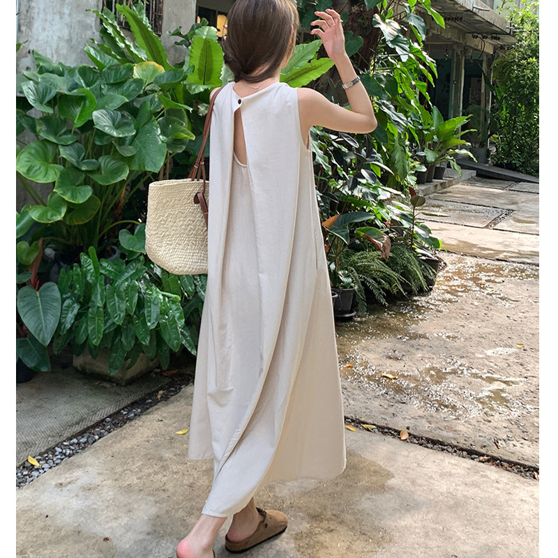 気質の袖のない綿麻のワンピースのゆったりした背中の透かし彫りのデザイン感の丸首の長いベストのスカート