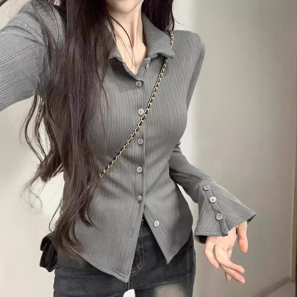 Polo襟ギャル正肩長袖tシャツ女性の秋のデザイン感があります。