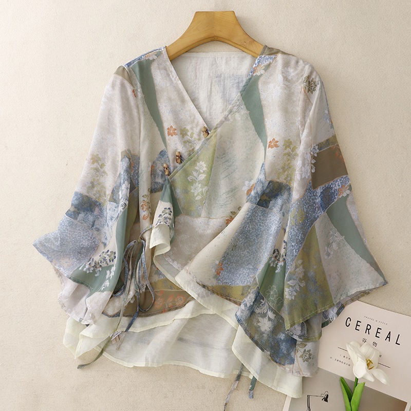 2025 夏の新エスニックスタイルレトロトップスラミー二重ガーゼ中国風カーディガン Tシャツ