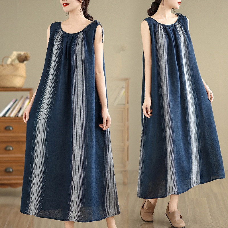 夏の新しいスタイルの肩レースアップリネンドレス女性のルーズレトロ文学ノースリーブロングドレス