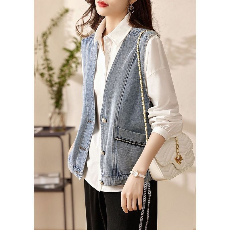 2025春秋新作デニムベストコート女性韓国風カジュアル百合ノースリーブvネックノースリーブベスト