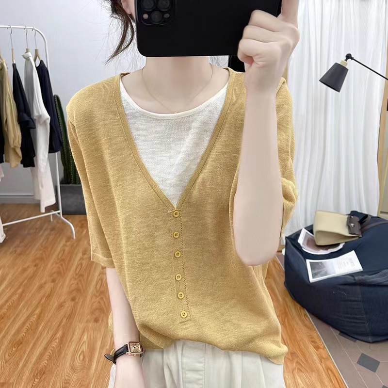 夏のアイスvネックの偽の半袖のニットの女性2025韓国系のゆったりしたtシャツの年齢を減らします上着のエアコンのシャツ