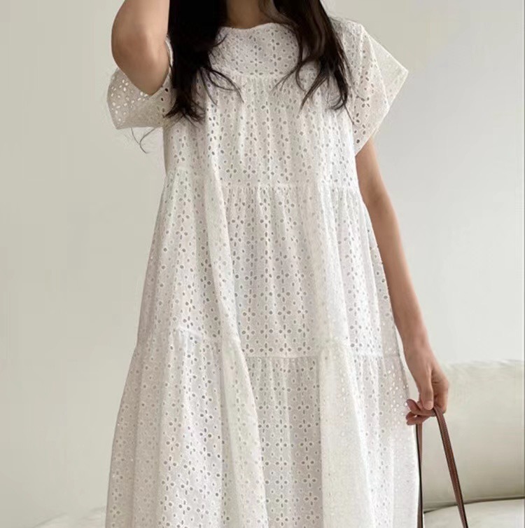 韓国シックなフレンチレトロラウンドネックヘビーデューティ中空かぎ針編みソリッドカラー半袖ドレス女性用