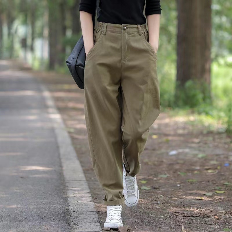 ゆったりとした足のハーレムズボンの女性は腰が高くて痩せています。