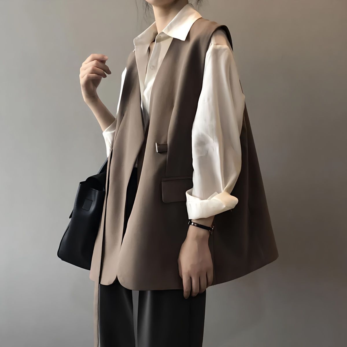 襟のないスーツのベストの女性のカレー色のvネックの外は春秋のファッションのフランスのinsのスーツのベストのストラップのジャケットを掛けます。