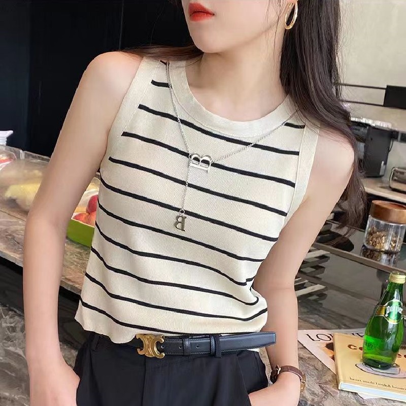 フランスのベストの女性の中には、新しいストラップのストライプのニットのノースリーブのギャルの上着を着ています。