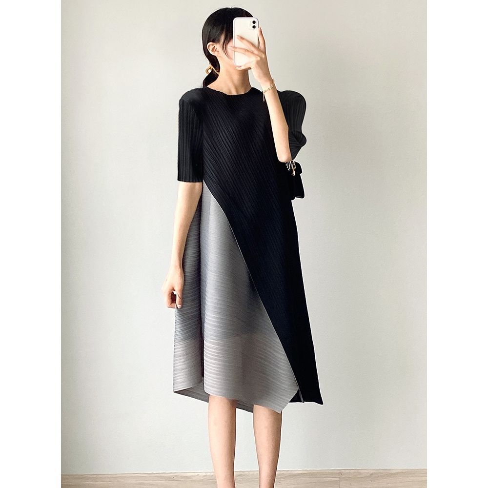三宅のしわの色合わせのワンピースの女性の中で長いタイプはゆったりしていて、やせている夏の新型の気質の半袖の洋風のスカートを現します。