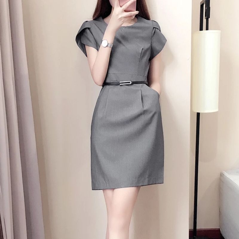 2025年夏新作 ウエストシェイプ オフィスワンピース おしゃれで上品 OL風 スリムフィット 細見え グレー レディースワンピース