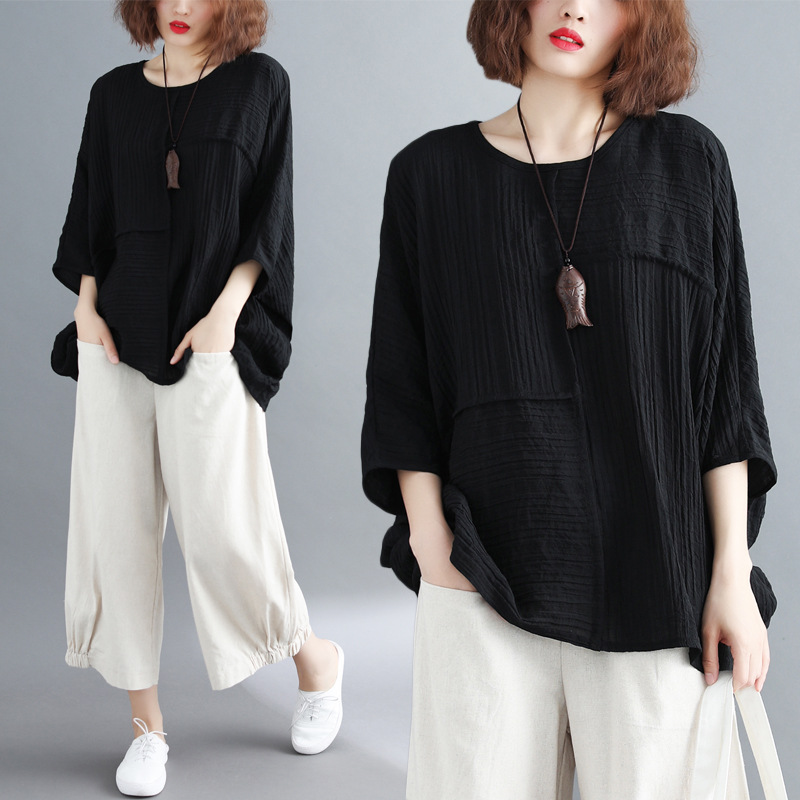 日韓の新型の純色の灯籠の袖の綿の麻のシャツの女性のゆったりしている子供の小さいシャツのデザイン感の9分の袖のファッションのシャツ