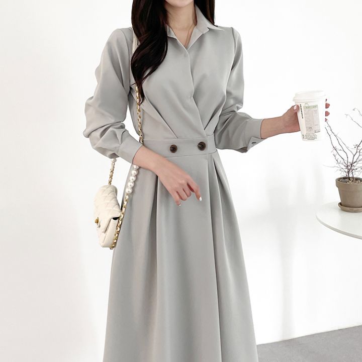 韓国のchi春のフランス式の大衆のデザインは腰を収めてやせている長袖のボタンのワンピースを現します。
