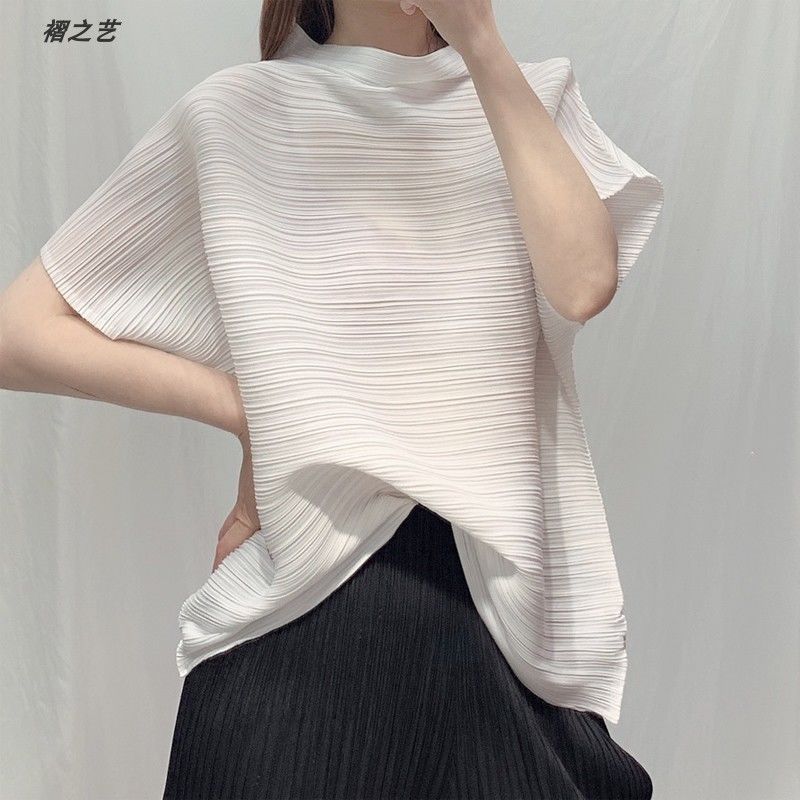 Tシャツの洋気の小さい立襟の女性のしわの2024春の新型のゆったりしていてやせているファッションの半袖の上着を現します。