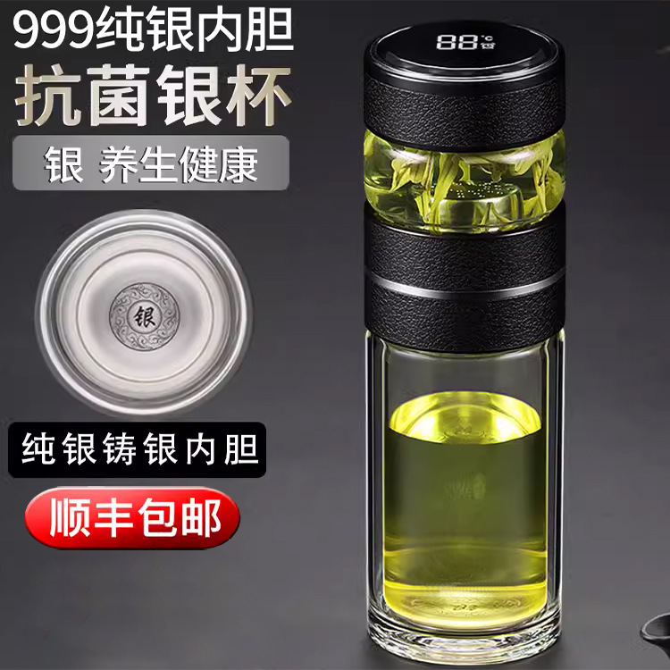 純銀茶水分離泡立て茶カップ二重ガラスカップ男性用999銀内胆保温水筒カップスマート温度測定機能付き