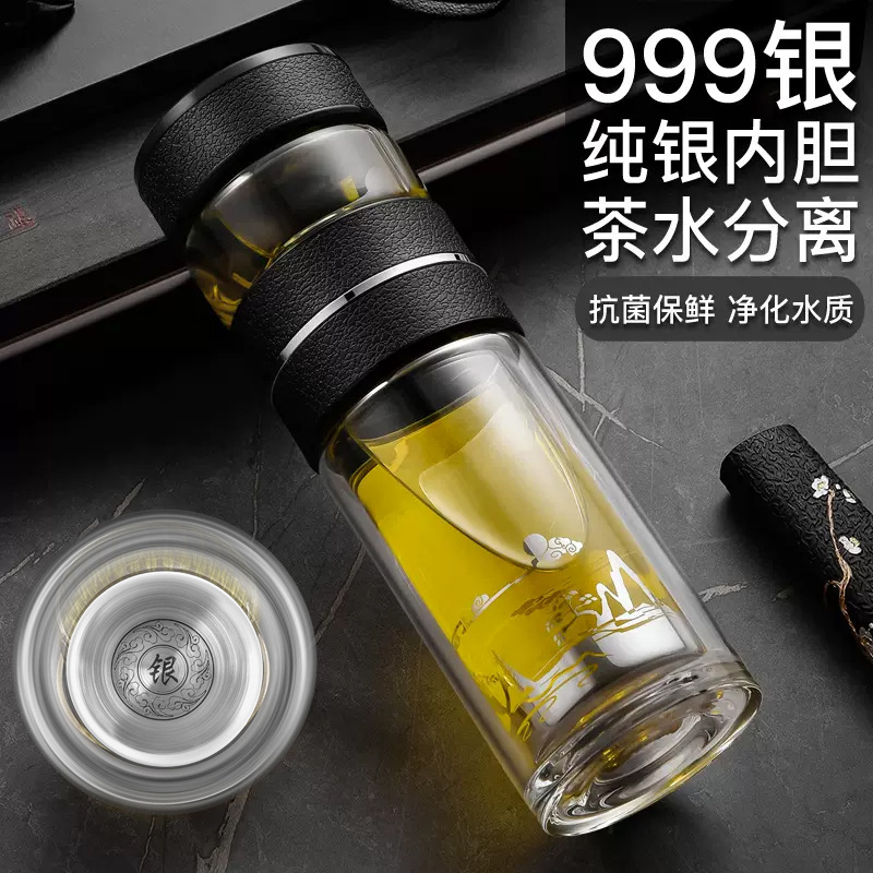 スターリングシルバー二重層高ホウケイ酸ガラス 999 シルバーライナー断熱水カップ男性と女性のティーカップセットシルバーカップ
