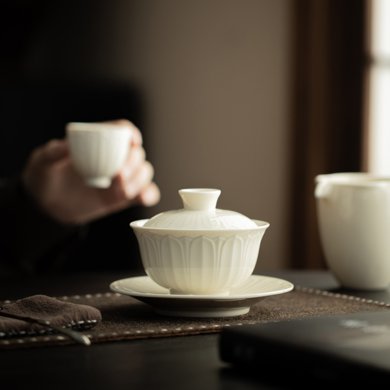 模造宋代定窯白三才蓋ボウルティーカップカンフーティーセット中国風レリーフティーボウル家庭用手作り蓋ボウルセラミック