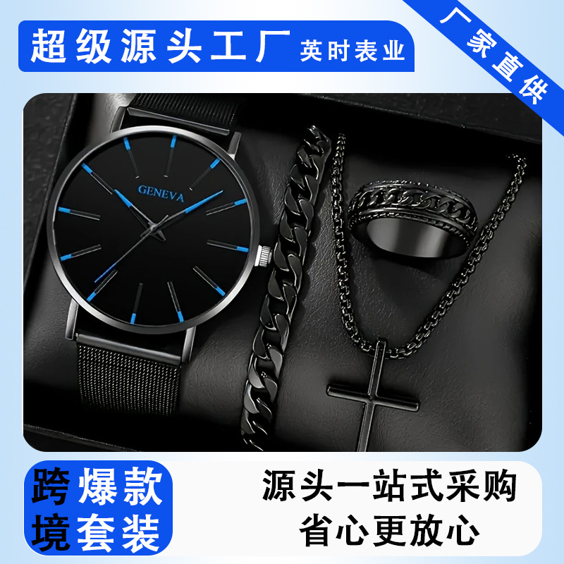 クロスボーダーホットスタイルファッションブルーニードルメッシュベルトメンズウォッチジュエリー4点セット全自動メンズガラスクォーツ時計