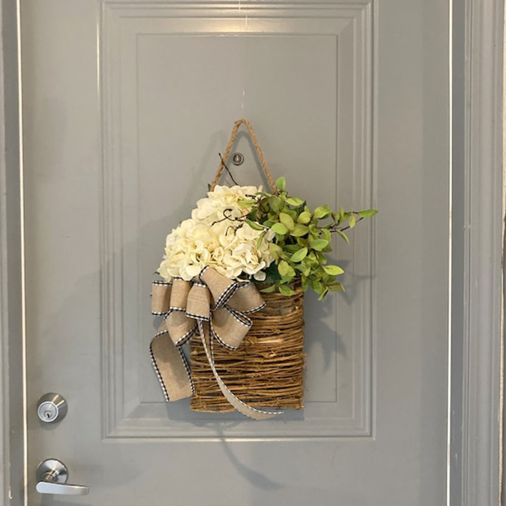 2024春のアジサイの花輪は花の藤のかごの扉の扉をシミュレーションして飾ります。